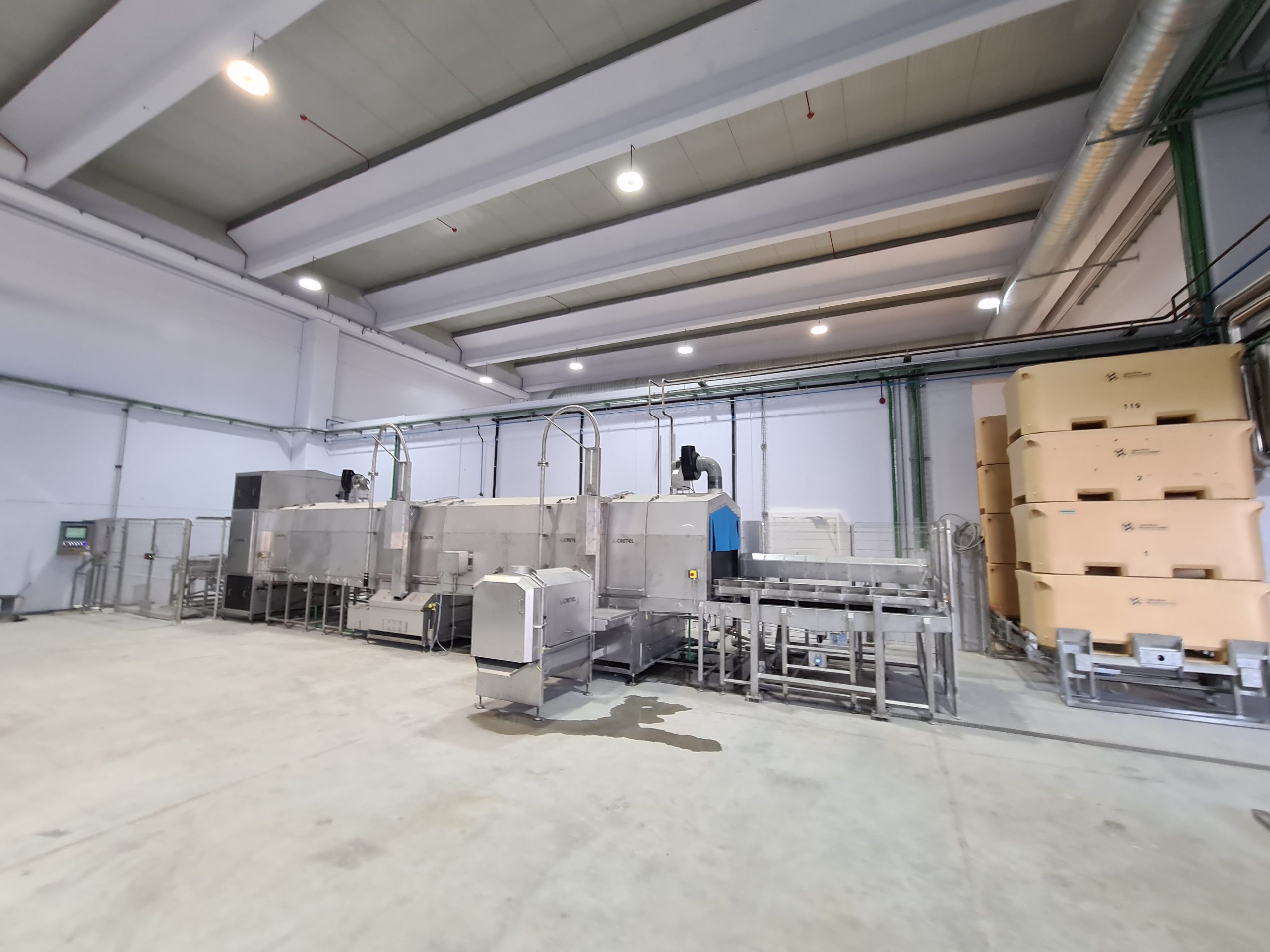 Lavado, secado y apilado eficiente y seguro de los contenedores de residuos de pescado